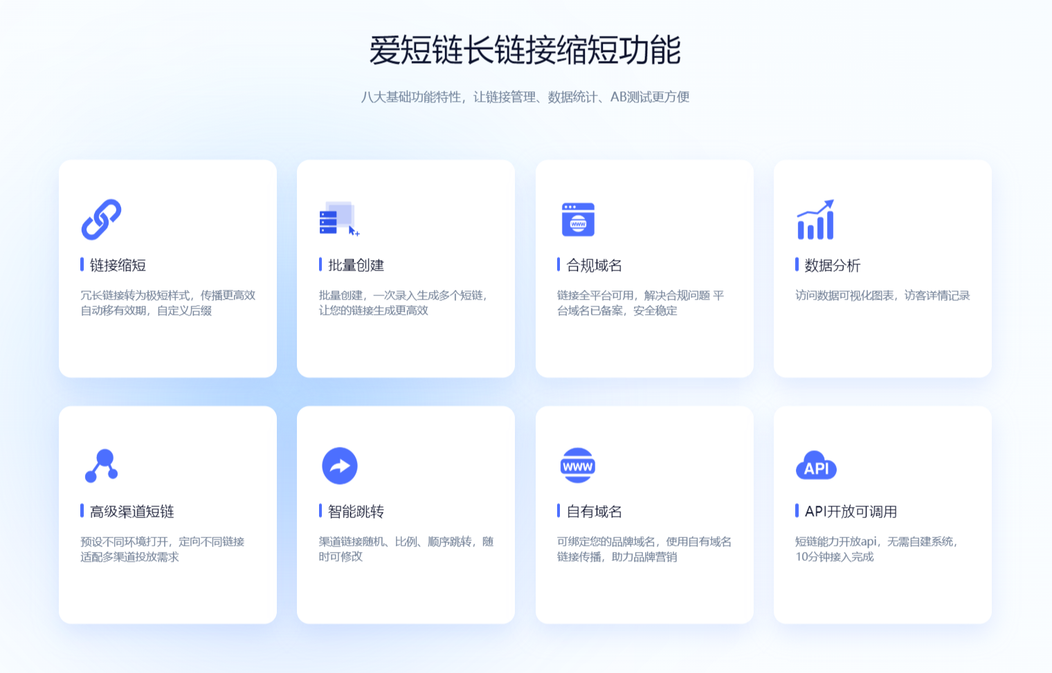 爱短链不仅支持单个创建短链,还支持批量创建、api接口调用创建,满足不同用户群体的需求;还支持使用自有域名,配置渠道短链、设置链接有效期,查看链接访问次数,进行数据分析等