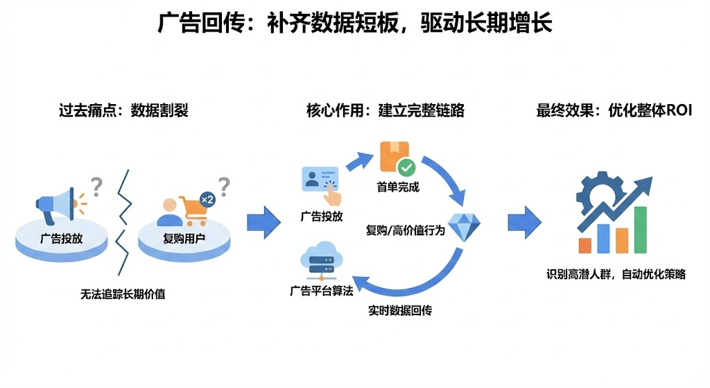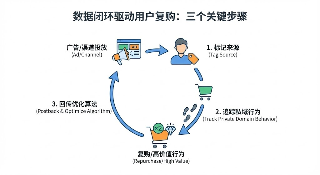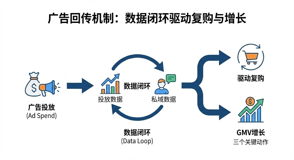 许多企业把预算砸在广告投放上,却无法追踪哪些用户后续产生了复购。广告回传机制恰好解决了这个问题——它把投放数据和私域运营打通,让你清楚知道每一分钱带来的长期价值。本文拆解数据闭环如何驱动用户复购,以及gmv增长的三个关键动作。