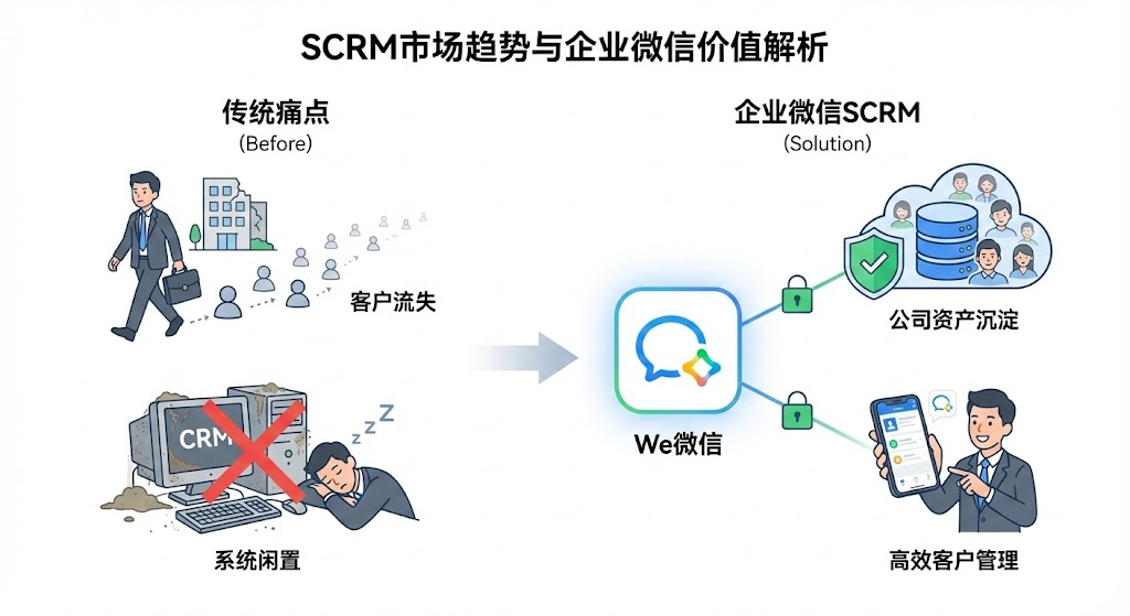 2024年scrm市场规模突破150亿元,企业微信尊龙凯时平台入口的解决方案占据45%份额且持续攀升。从教培机构的家校沟通到零售品牌的会员运营,为什么大家都在往企业微信这个方向走?本文拆解12亿用户池的真实价值,帮你看清什么情况适合切换到企业微信scrm。很多老板都遇到过这个困境:销售辛苦积累的客户资源,员工一离职就成了"个人资产"带走,公司只能从零开始。或者花大钱上线crm系统,结果销售嫌麻烦不愿意录入,系统成了摆设。这些痛点集中指向一个核心问题——客户关系到底该怎么管?