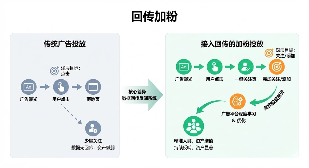 传统广告投放和接入回传的加粉投放,表面看都是让用户关注公众号或添加企微,但底层逻辑完全不同。前者只管把人拉进来,后者会持续追踪用户行为并反哺广告系统。这种差异会在三个月、半年后形成巨大的资产鸿沟。