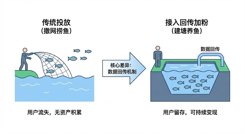同样花钱投广告加粉,有人积累了可持续变现的用户资产,有人只收获了一堆僵尸粉。核心差异在于是否接入数据回传机制。传统投放像撒网捞鱼后又放生,回传加粉则是建鱼塘养殖。很多企业投信息流广告时会发现:明明都是加粉,为什么有的账号半年后还能持续产生订单,有的粉丝加完就成了摆设?问题不在粉丝数量,而在你用什么方式把他们留下来。