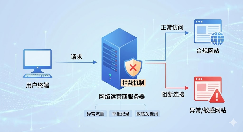 访问网址时,请求会先经过网络运营商的服务器。如果运营商检测到该域名存在异常流量、曾被举报或包含敏感关键词,就会直接阻断连接。判断方式很直接:换个网络环境试试。用手机4g能打开,但公司wifi打不开?多半是企业网络的安全策略在起作用。如果所有国内网络都无法访问,但切换到海外代理后能正常加载,就说明是区域性限制。