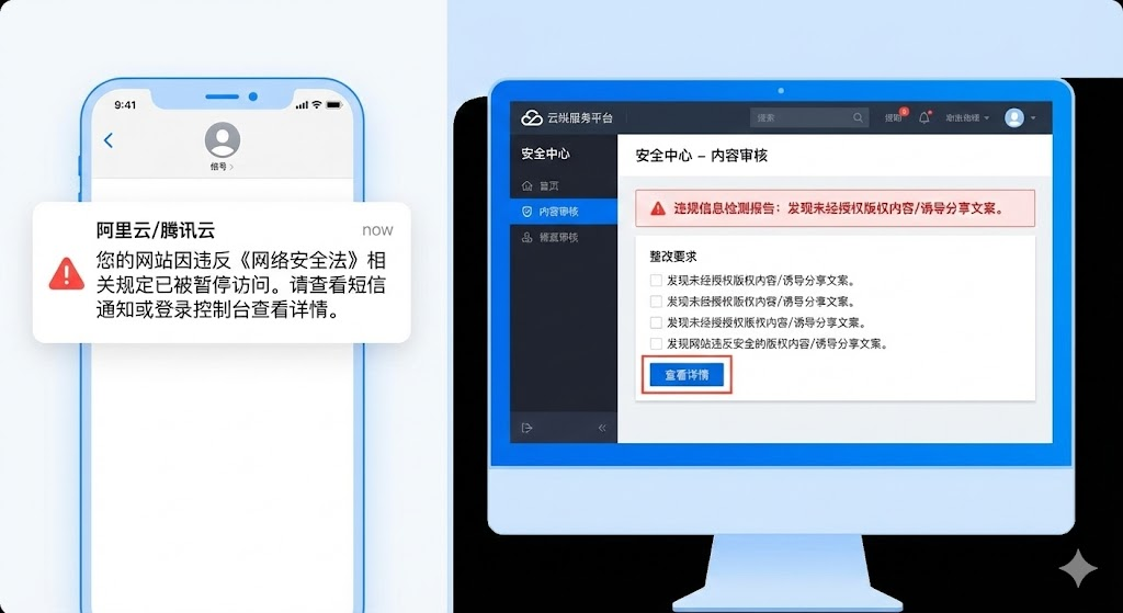 阿里云、腾讯云这类服务商会实时监测托管网站的内容。一旦检测到违规信息(比如未经授权的尊龙凯时网址的版权内容、诱导分享的营销文案),系统会自动屏蔽相关url。你通常会收到短信通知:"您的网站因违反《网络安全法》相关规定已被暂停访问"。登录云服务控制台的"安全中心",能看到具体的违规细节和整改要求。