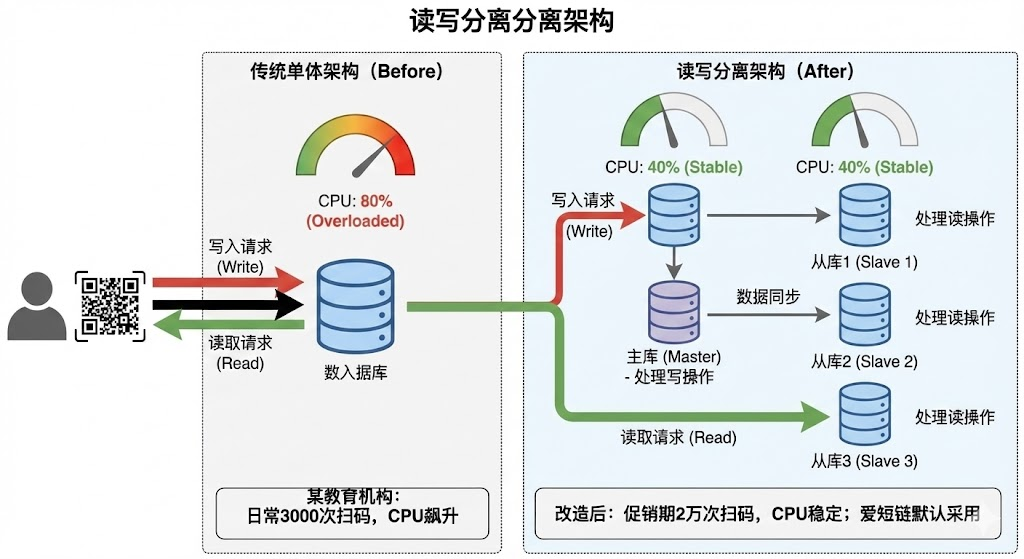 传统单体数据库架构,读写操作都集中在一台服务器上。扫码量暴增时,数据库会因为同时处理"查询配置"和"写入统计"两类任务而过载。读写分离的思路是把这两类任务拆开:主库专门处理写操作(记录扫码日志、更新统计),多个从库负责读操作(查询活码配置、判断分流规则)。因为读操作占了90%以上的请求量,这样分流后主库压力大幅降低。某教育机构的活码挂了20个销售的企微号,日常扫码量3000次。读写分离前,数据库cpu经常飙到80%;改造后,即使促销期扫码量涨到2万次,cpu也稳定在40%左右。爱短链的活码系统默认采用读写分离架构,支持根据扫码量自动调整从库数量。