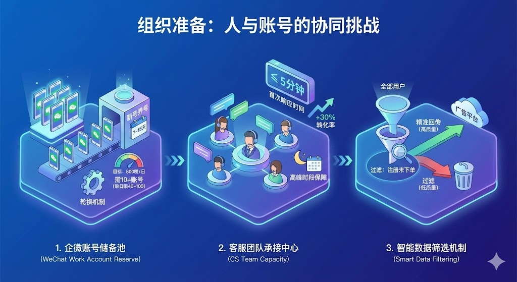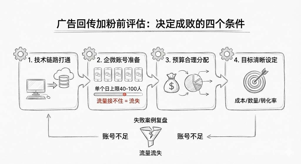 信息流广告加粉看起来门槛不高,但很多企业投了几万块发现成本失控、账号被封、数据对不上。问题往往出在启动前没做好评估。技术能不能打通数据链路?企微账号够不够用?预算怎么分配?目标设定是否清晰?这四个前提条件没理清楚,后面的投放就是在烧钱试错。最近接触一家做职业教育的公司,他们在抖音投了两周广告,加粉成本从预期的15元飙到40元。复盘发现根本原因不是素材不行,而是启动前没确认企微账号数量够不够。单个账号日加粉上限是40-100人,他们只准备了5个账号,广告一跑起来根本接不住流量,导致大量用户流失。