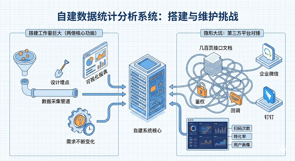 扫码次数、转化率、用户画像分析,这些功能在成熟工具里是标配,但自建系统需要从零搭建。设计埋点方案、搭建数据采集管道、开发可视化报表,工作量至少是核心功能的两倍。更麻烦的是数据分析需求会不断变化,今天运营要看地域分布,明天市场要看渠道对比,每次新需求都要改代码、测试、上线。第三方平台对接也是隐形大坑,活码要对接企业微信或钉钉,你得啃完几百页的接口文档,处理各种鉴权、回调、消息推送逻辑。