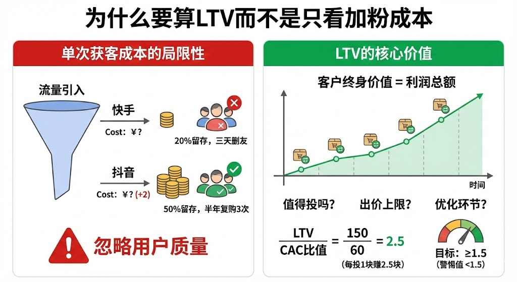 • 单次获客成本的局限性:很多操盘手习惯用"加粉成本"判断投放效果,但这个逻辑有致命漏洞——没有考虑用户质量。快手来的粉丝可能留存率只有20%,三天就删好友;抖音来的用户虽然贵2块,但半年留存能到50%,复购3次