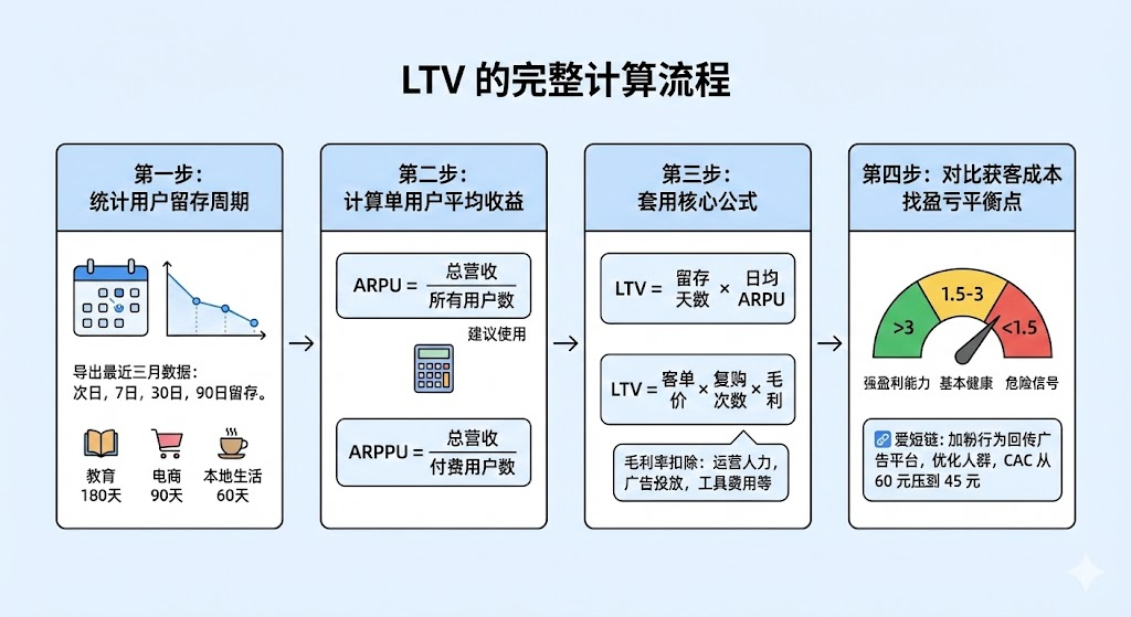 • 第三步套用核心公式:最简化公式是ltv=留存天数×日均arpu。如果业务有明确复购周期,用ltv=客单价×复购次数×毛利率。毛利率要扣除运营人力、广告投放、工具费用等分摊成本