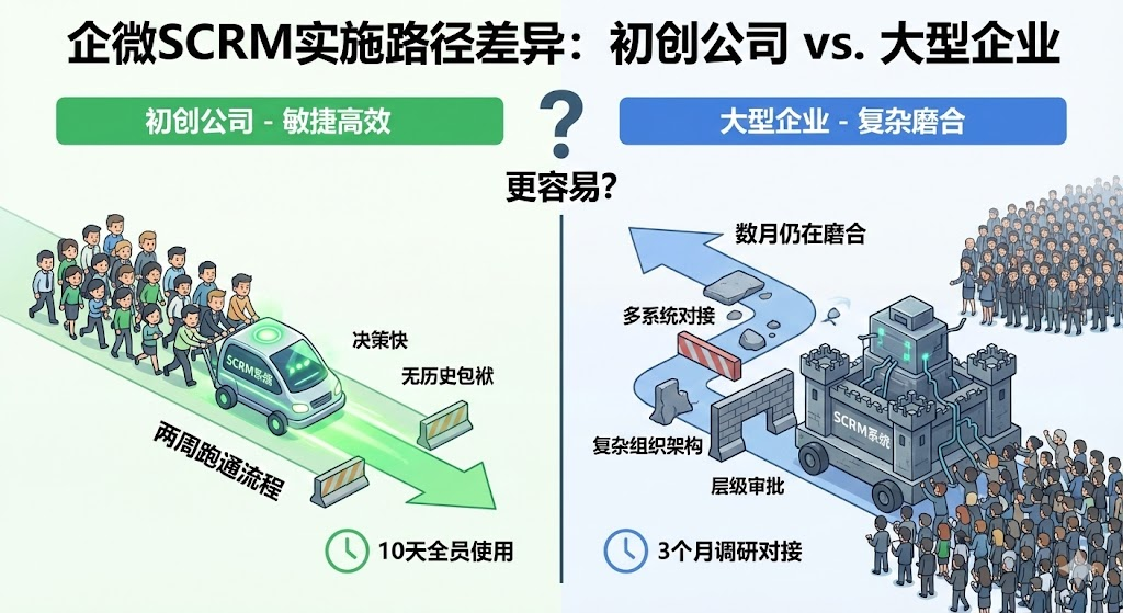同样是部署企微scrm系统,初创公司往往两周就能跑通流程,大型企业却可能耗时数月仍在磨合期。这背后不是工具本身的问题,而是企业规模、组织架构、历史系统积累带来的实施路径差异。很多人以为企微scrm是大企业的专属配置,但实际观察下来,反而是初创团队更容易把系统用活。一家50人的教育机构,从决定上系统到全员正常使用,前后只花了10天;而某家千人规模的制造企业,光是前期调研和系统对接就耗了3个月。