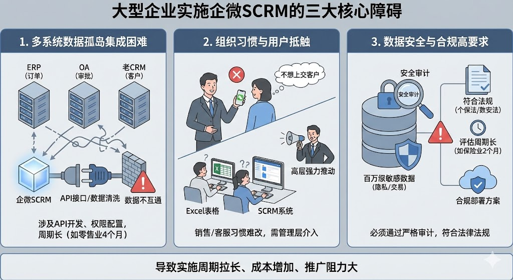 大型企业手里通常有erp管订单、oa走审批、老crm存客户资料,各个系统之间数据不互通。企微scrm要接入进来,就得开发api接口、做数据清洗、配置权限规则。某家连锁零售企业在实施时,线下门店用的是老收银系统,线上商城走的是另一套电商平台,会员数据散落在三个地方,整个对接周期拉长到4个月。销售习惯了用个人微信加客户,突然要求全部转到企业微信,意味着客户资源要上交给公司。客服团队原本各自维护excel表格,现在要统一录入scrm系统,工作习惯得重新适应。没有高层强力推动,很容易出现系统买了但没人用的尴尬局面。大企业的客户数据量动辄百万级,涉及个人隐私、交易记录等敏感信息。企微scrm的部署方案必须通过信息安全审计,符合数据安全法和个人信息保护法的要求。某家保险公司在选型阶段就花了2个月做安全评估,确认数据存储位置、加密方式、权限管理机制都符合监管要求后才敢正式签约。