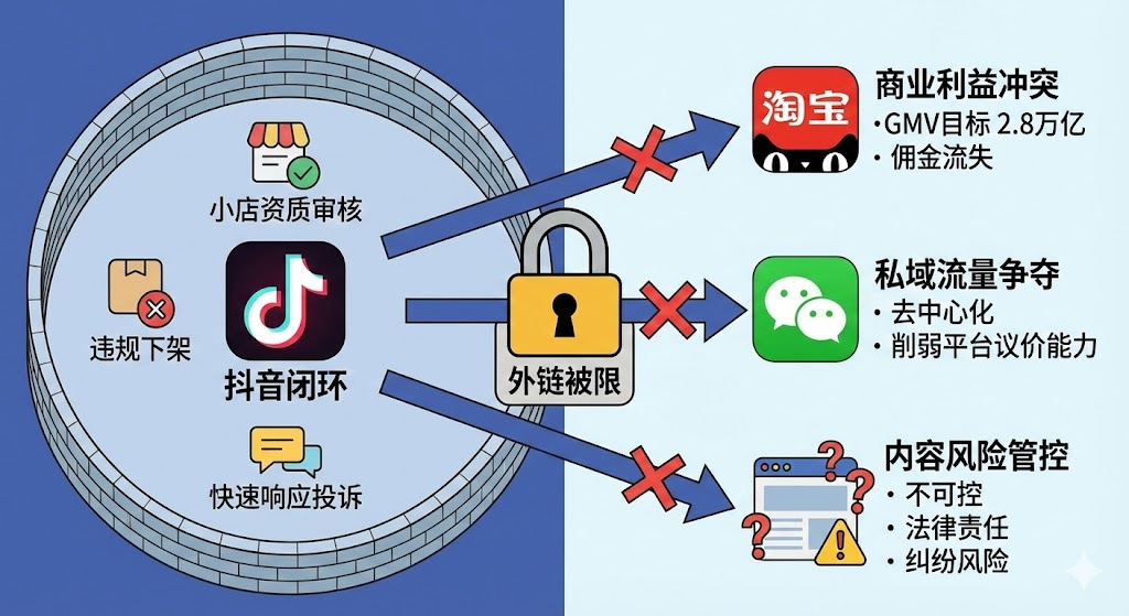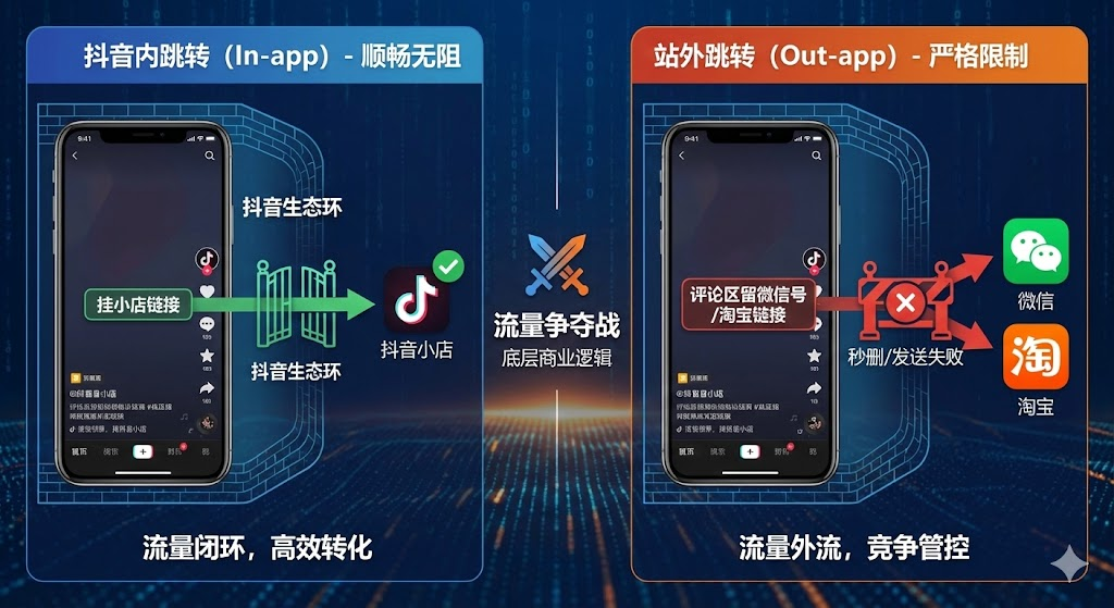 抖音为什么严格限制微信、淘宝外链?表面是技术管控,实质是流量争夺战。本文拆解平台内跳转与站外跳转的核心差异,揭示外链管制背后的商业逻辑,并提供商家在当前环境下的实操应对方案。