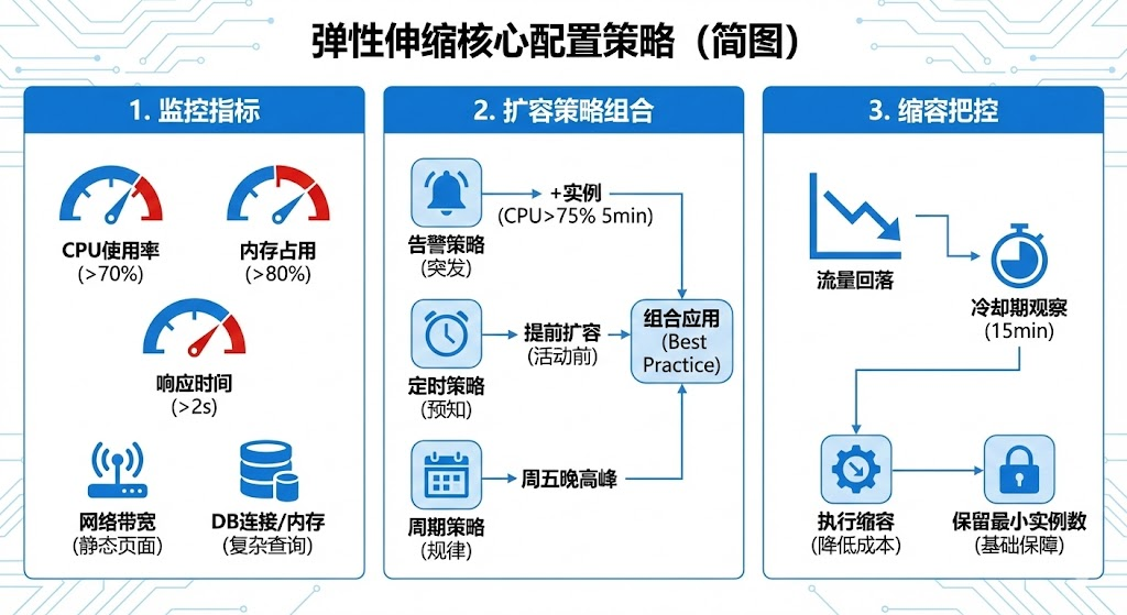 2. 扩容策略的组合使用:告警策略适合应对突发流量,设置当cpu持续5分钟超过75%时自动增加2台服务器实例;定时策略用于应对可预见的流量高峰,活动在晚上8点开始可设置7点30分自动扩容;周期策略适合有规律的业务波动,每周五晚间是用户活跃高峰可设置自动增加实例。实际应用中,建议将三种策略结合,用定时策略应对已知的活动时段,用告警策略兜底突发情况,用周期策略优化日常成本。