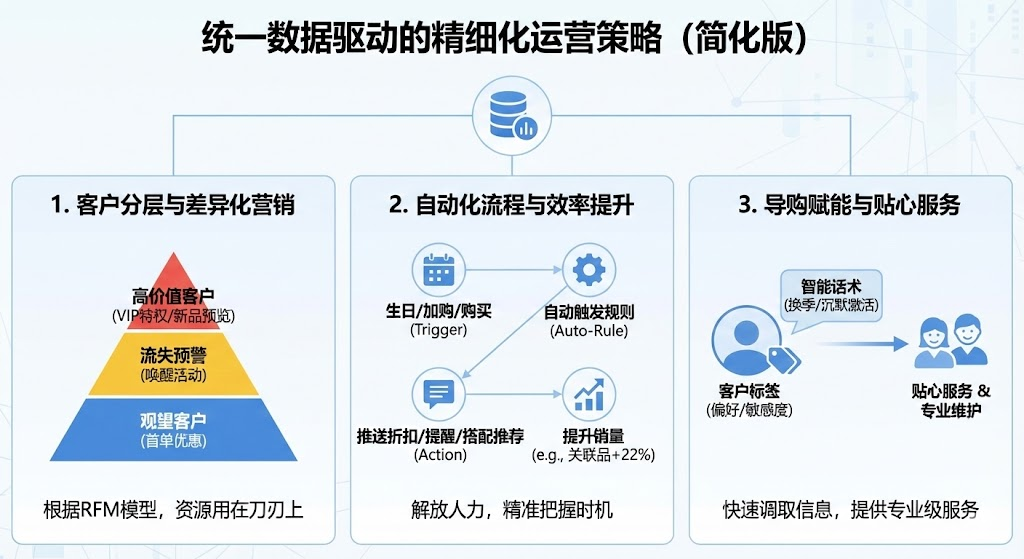 张女士周一在门店扫码加了导购企微,周三在小程序下单,周五咨询客服。系统自动把这三次行为关联到同一个客户档案,导购打开聊天窗口就能看到她的完整消费轨迹和咨询记录。传统会员管理需要人工给客户打标签,费时费力还容易遗漏。
