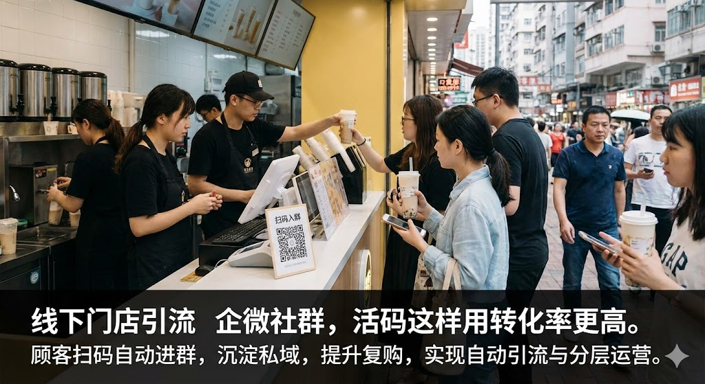 线下门店客流转化一直是难题,顾客进店消费后就失联,复购全靠运气。开一家奶茶店,每天接待200个顾客,能加上微信的不到20个。收银员忙着找零,顾客急着赶路,错过的每个人都是流失的复购机会。企微群活码能把每个到店顾客沉淀到私域,配合收银台、外卖包装等触点布局,实现自动引流和分层运营。它是一个永久有效的二维码,顾客扫码后自动进群,不需要人工审核,也不会因为群满员而失效。