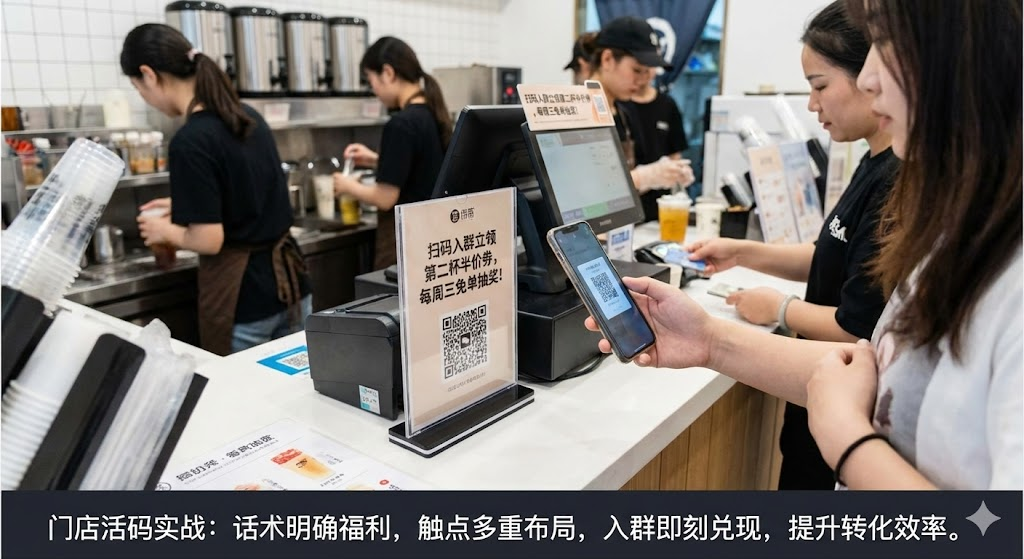 • 餐饮店适合用"进群领券加每日特价"的组合:顾客消费频次高,用优惠券能快速促成复购。在收银台和外卖袋同时放码,线上线下一起引流,覆盖到店和外卖两种场景的客户群体。