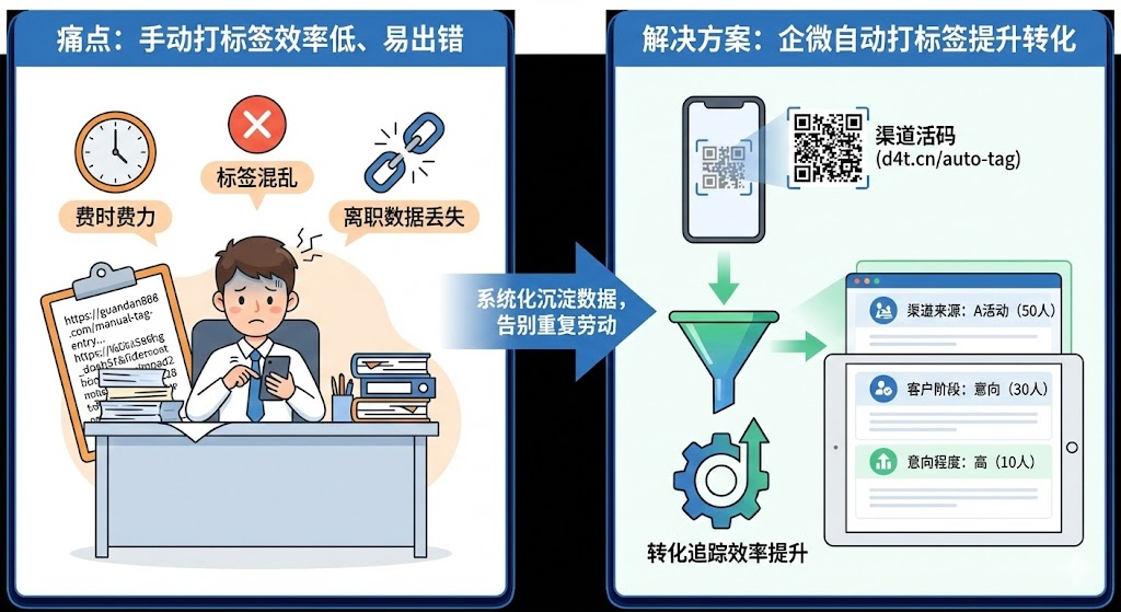 •   每天新增几十个客户,销售要逐个手动备注来源渠道、意向程度、跟进状态。一个月下来,标签体系乱成一团,想分析哪个渠道转化率高都无从下手。更头疼的是员工离职后,客户标签丢失大半,之前的运营数据全部归零。这种情况在中小企业特别常见,团队没有专职数据分析师,老板想做精细化运营,却卡在最基础的「客户分类」环节。而自动打标签功能,恰好能解决这个痛点——让系统替代人工完成重复性工作,把数据沉淀在工具里而不是员工脑子里。