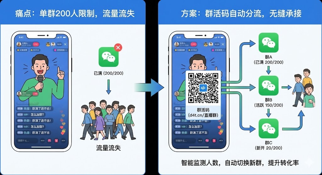 • 传统微信群二维码存在7天有效期和200人上限两个致命缺陷,普通二维码满员后彻底失效,直播间观众扫码只会看到「该群聊人数已满」的提示,没有任何补救空间