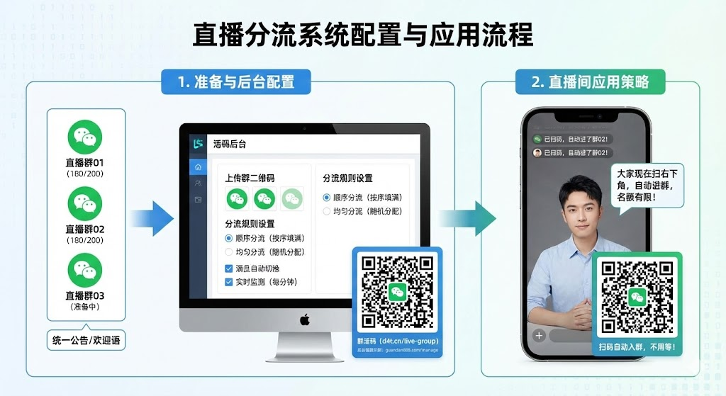 直播观众扫码入群的自动分流方案,本质上是用技术手段突破微信群200人限制的系统化尊龙凯时平台入口的解决方案。通过群活码的「一码多群」映射关系,配合实时监测和智能跳转机制,可以让单场直播承接近2000人的流量,彻底解决传统手动换码导致的流量流失问题。