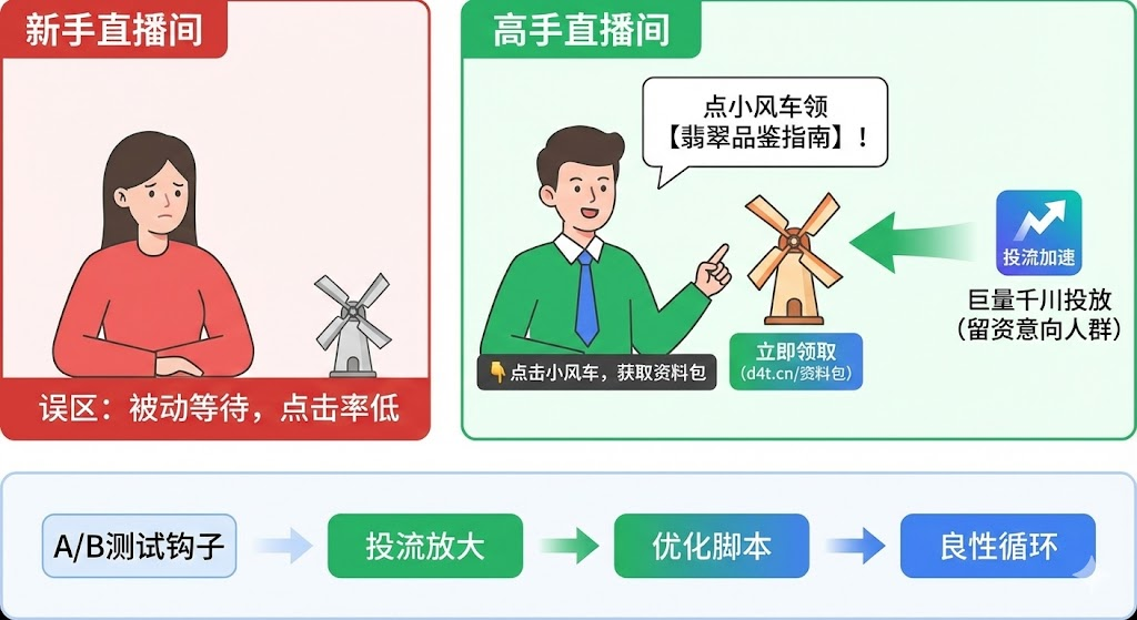 小风车挂上去只是第一步,更重要的是主播要主动引导用户点击。很多新手以为挂上组件就够了,实际上用户根本注意不到那个小图标。主播需要每隔几分钟就口播提醒一次,并且要给用户一个明确的理由。不要只说「点小风车加我微信」,而是要说「点小风车领取免费方案」「加微信送行业资料包」「想了解具体价格的点小风车」。用户需要知道点击后能得到什么,才会有动力去操作。