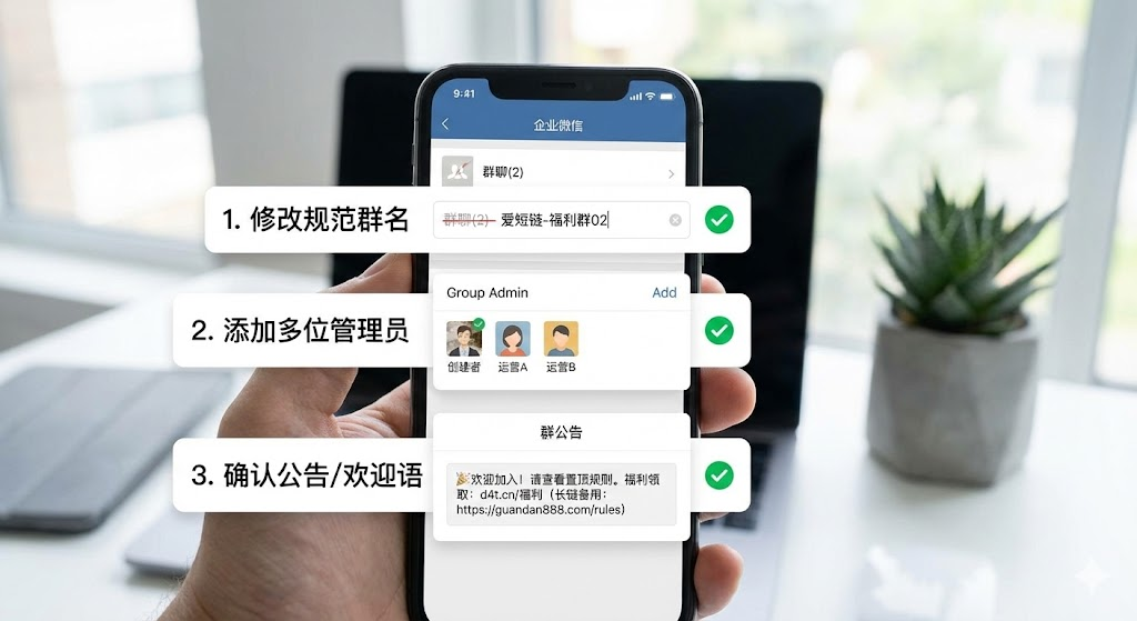 其次要设置群管理员。自动创建的新群默认只有创建者一个管理员,如果团队有多个运营人员,记得把他们都加进去。最后检查群公告和入群欢迎语有没有同步过来。有些企业的群公告里会放活动规则或福利领取方式,新群建立后最好再确认一次,避免遗漏。