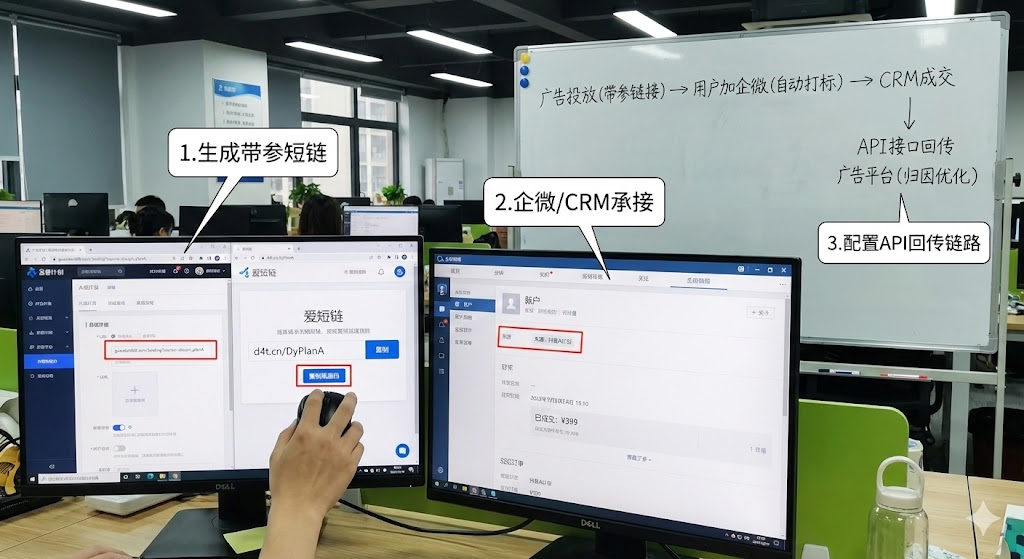 投放广告时,需要在落地页链接里加入追踪参数。比如抖音的a计划用参数「source=douyin_plana」,快手的b素材用「source=kuaishou_materialb」。用户通过这些链接添加企业微信时,系统会自动记录他的来源标签。爱短链在这个环节提供了便捷的渠道码生成功能,你可以为不同广告计划批量创建带参数的短链接,用户扫码添加企业微信后,来源信息会自动同步到crm系统。