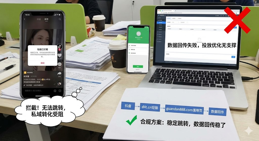 在抖音投放广告引流私域时,不少运营会遇到这样的困境:链接刚上线没几天就被拦截,用户点击后跳不出去,或者跳转成功了却看不到后续数据。这不仅影响转化效果,更让投放优化失去了数据支撑。解决这个问题,需要从合规性和技术稳定性两个维度入手,而不是简单换个短链接就能搞定。抖音对外链的管控主要基于用户体验和生态安全,平台会识别链接的跳转路径、落地页内容、域名历史记录等多个维度。