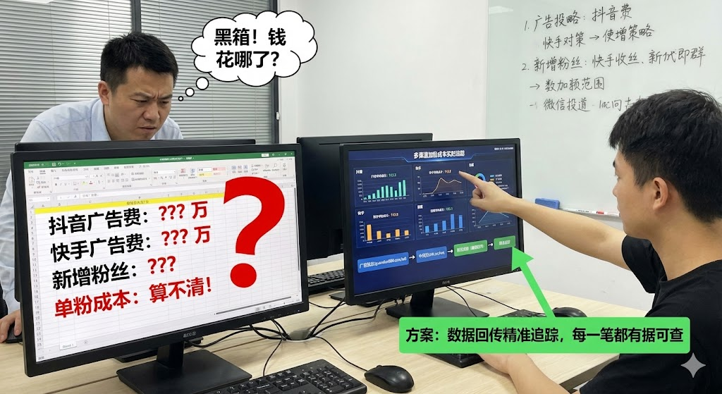 投信息流广告加粉,花了几万块却不知道单个粉丝多少钱?核心问题在于缺少数据回传机制。不少中小企业主遇到过这种情况:在抖音、快手投了几轮信息流广告,后台曝光量看着挺漂亮,但加了多少粉丝、每个粉丝花了多少钱,完全算不明白。月底对账时只能看到总花费和微信新增人数,中间的转化路径就像黑箱,想优化投放根本无从下手。本文从成本统计难点出发,讲解如何通过广告平台的数据回传功能,实时追踪抖音、快手、百度等渠道的加粉成本,让每一笔广告费都有据可查。