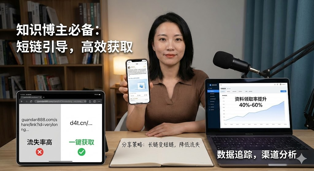 很多知识博主都遇到过这样的困扰:精心整理的资料包发出去,点击量却少得可怜。问题往往不在内容质量,而在分享方式。一串冗长的网盘链接贴在评论区,要么显示不全,要么让粉丝复制粘贴好几次才能打开。每多一个步骤,就会流失一批人。短链工具把长链接压缩成几个字符,粉丝点一下就能直达资料页面,还能追踪哪些渠道效果好、哪些时间段粉丝最活跃。知识博主分享资料时,长链接显示不全、跳转繁琐常导致粉丝流失率超过30%,用短链工具压缩网址,能让粉丝一键获取资料,配合数据追踪和平台适配策略,可将领取率提升40%-60%,有效降低流失。