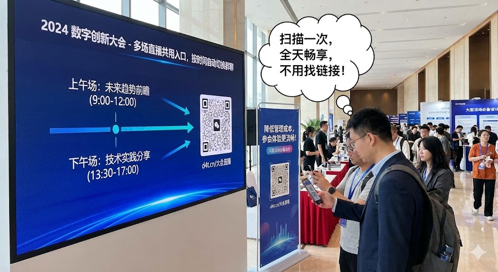 办过多会场活动的人都知道,给每个直播间单独发链接,观众容易迷路,运营也累。现在有种方案能让所有场次共用一个入口,系统根据时间表自动把用户引导到对应群聊或直播间,既降低管理成本,又让参会体验更流畅。大型活动最头疼的事情之一,就是同时进行多个分会场。运营团队要准备好几套宣传物料,每个会场配一个专属链接。观众收到一堆二维码和网址,不知道该点哪个。等到想看下午场的时候,又得翻聊天记录找链接。这种体验对主办方和参会者来说,都是负担。如果能用一个固定入口覆盖全部场次,让系统按时间表自动分流,整个流程会清爽很多。