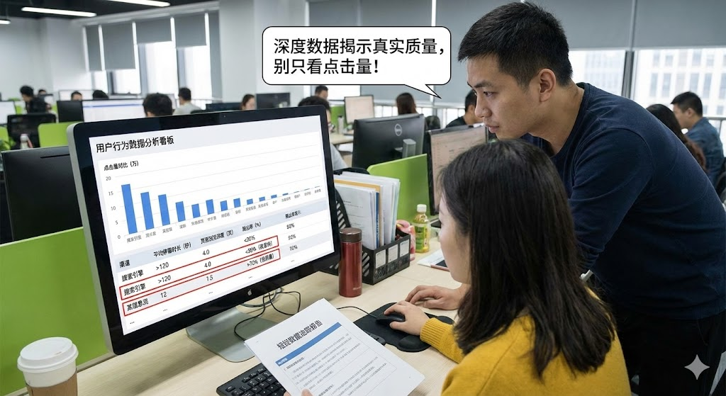 • 某信息流渠道带来的用户,平均停留12秒就离开,页面浏览深度不到1.5页。搜索引擎带来的用户,平均浏览4个页面,停留超过2分钟。后者意向度明显更高,即使点击成本贵些,长期roi也更好