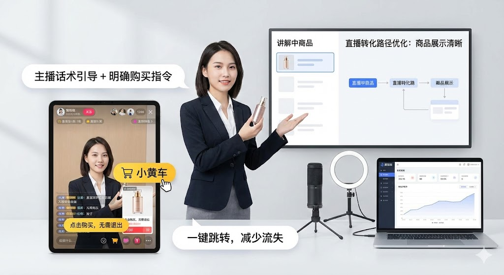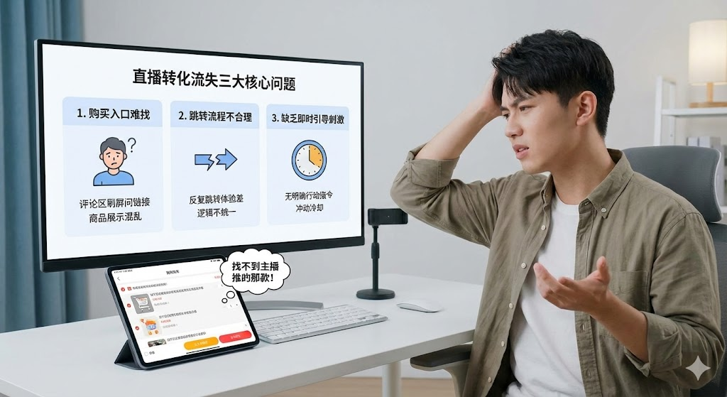直播带货最头疼的不是没流量,而是流量来了却留不住。数据显示,进入直播间的用户中,接近一半会因为找不到商品链接或购买流程不顺畅而离开。这些本该成交的客户,最终变成了"看热闹"的过客。核心问题在于转化路径设计,主播正在讲解产品卖点时,观众产生购买冲动,但如果需要退出直播、翻评论区找链接、再跳转到商品页,这个过程每多一步,流失率就会增加。