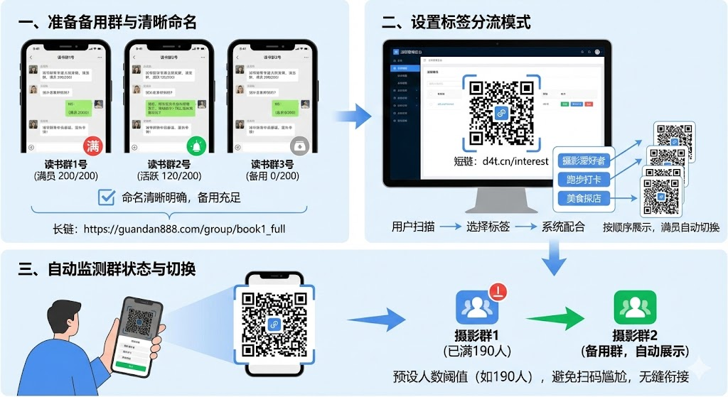 设置活码之前,先把各个主题的社群准备好。每个主题建议准备2-3个群作为备用,避免单个群满员后无法承接新用户。运营读书社群时准备「读书群1号」「读书群2号」,当1号群满员时,活码自动展示2号群的二维码。群的命名要清晰明确,用户看到群名称就知道这个群是做什么的。