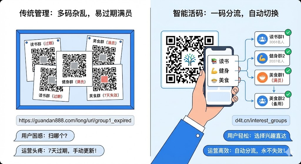 管理多个主题社群时,入口混乱是最大的麻烦。公众号文章、朋友圈、海报上放多个二维码,用户体验很差。有人随便扫一个进群,发现内容不对又退出来重新找,既浪费时间又影响群氛围。传统群二维码的时效限制更让人头疼,微信群二维码7天失效,qq群二维码虽然长期有效,但满100人后就无法扫码入群。
