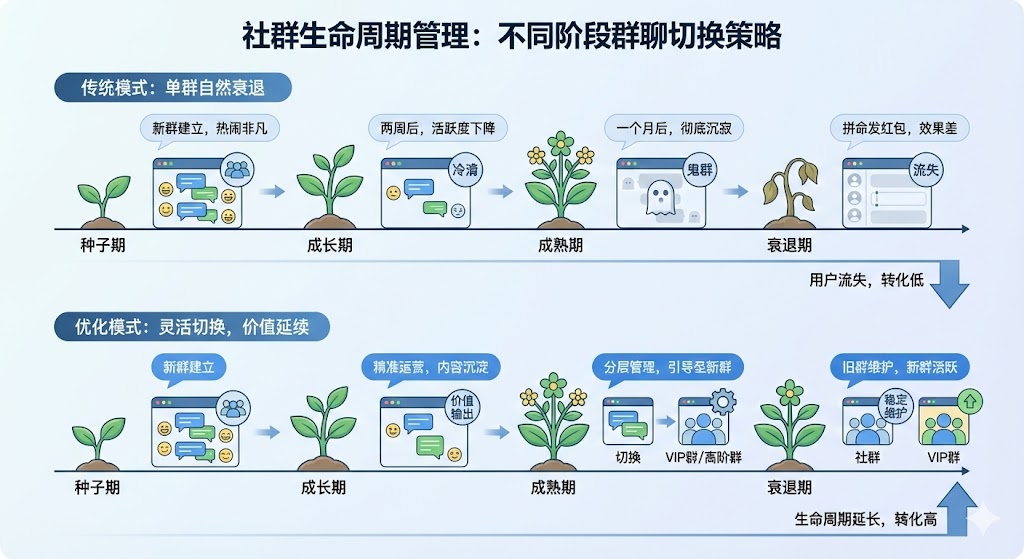种子期、增长期、转化期需要不同的群聊策略,灵活切换才能延长社群存活时间。本文拆解各阶段的运营重点,帮你建立可持续的私域流量池,避免用户流失和转化低效。社群生命周期管理的终极目标,是建立可持续的私域流量池。这需要你在不同阶段灵活切换策略,而不是用一套方法走到底。