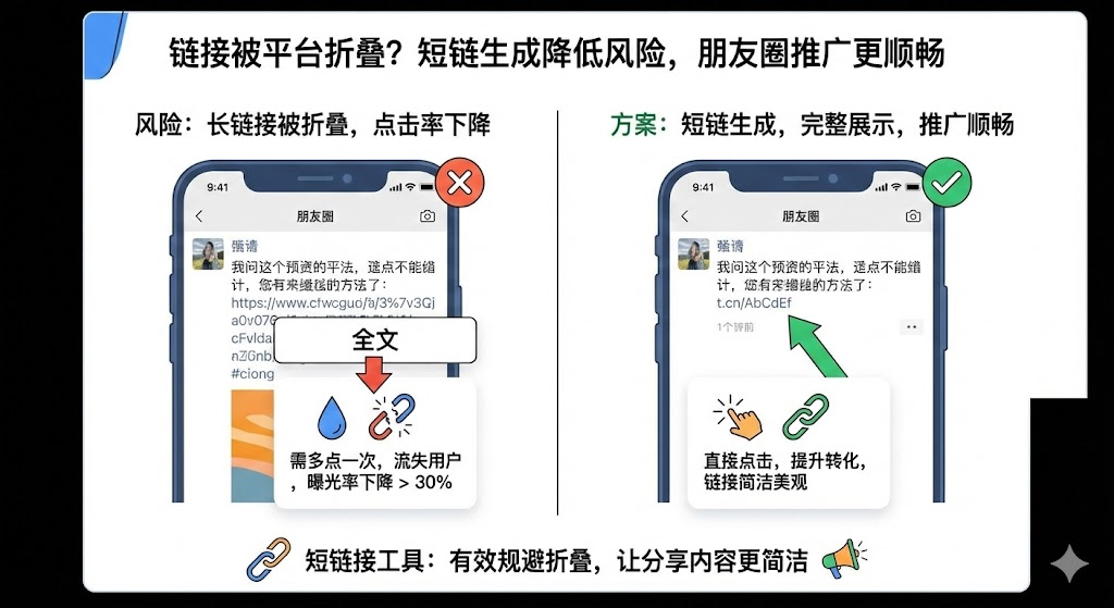 微信朋友圈对文字内容有字符数限制,超过一定长度就会自动收起。长链接包含多个参数和路径,动辄几十甚至上百个字符,很容易触发折叠机制。这种设计本意是保持信息流整洁,但对需要分享链接的运营人员来说,就成了实实在在的障碍。