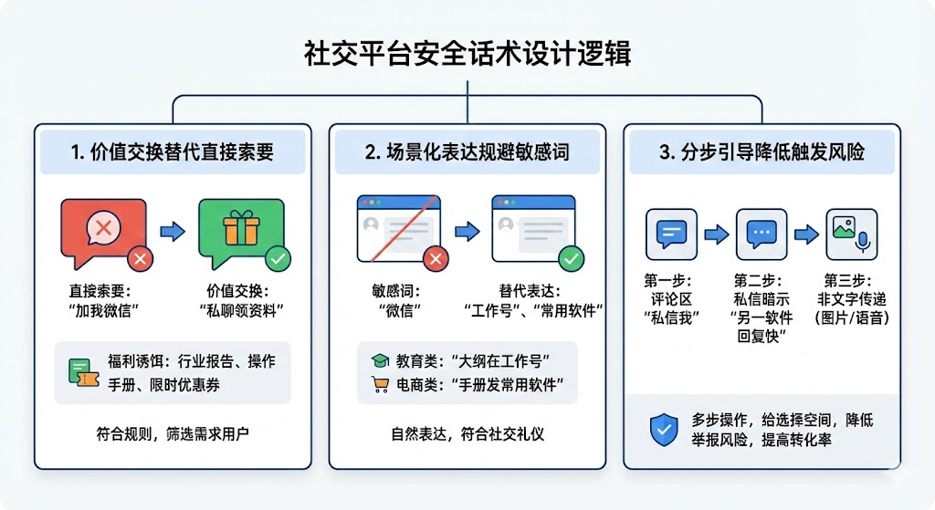 • 分步引导降低触发风险:先在评论区用"私信我"建立初步联系,然后在私信里用暗示性话术,比如"平时在另一个常用软件回复更快",试探对方意愿。如果对方表现出兴趣,再通过图片、语音这些非文字形式传递具体信息。整个过程分成多个步骤,每一步都给对方选择空间,既降低被举报风险,也提高最终转化成功率。