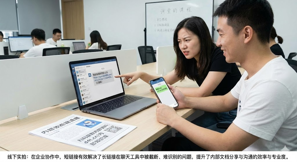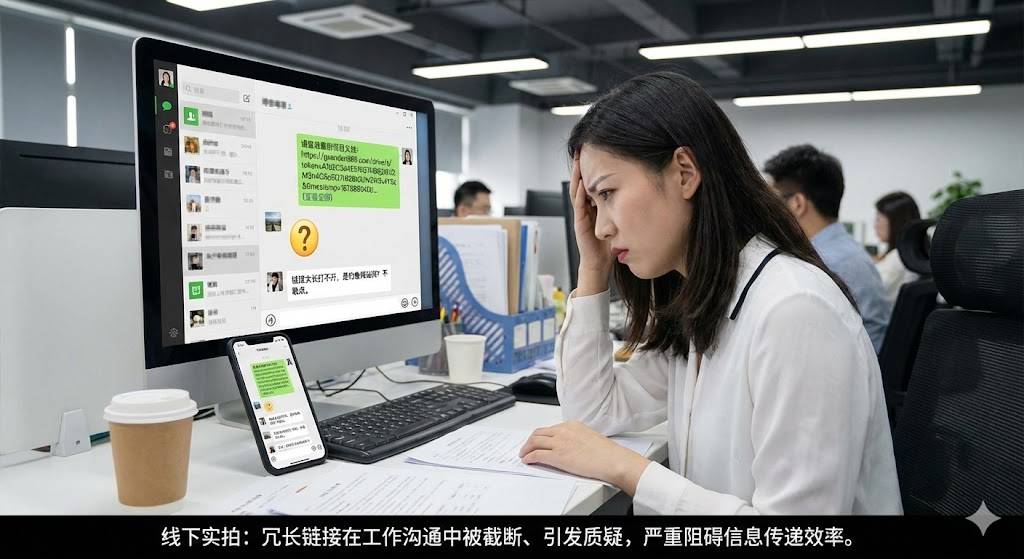 微信群里发送超过八十个字符的链接,系统会自动换行。链接里包含特殊符号或中文参数,可能被折叠成"查看全部"。接收方需要先点开折叠内容,再长按复制,有时还要分段拼接。一个简单的文档分享,变成了多步操作。钉钉虽然对长链接的处理稍好,但移动端查看时,链接依然会占据大量屏幕空间,把正常对话挤得七零八落。