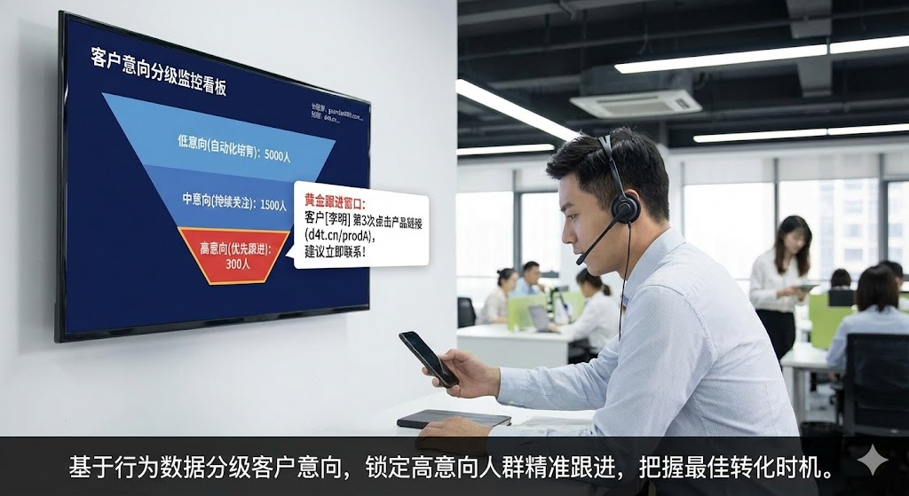 不是所有点击链接的客户都值得立即跟进,需要根据行为数据做分级。低意向客户可能只是随便看看,点击一两个链接就离开了。中意向客户会浏览多个产品,但停留时间不长。高意向客户会反复访问同一产品,或者在页面停留超过一定时长。把有限的销售资源优先投入到高意向客户身上,能大幅提升整体转化率。