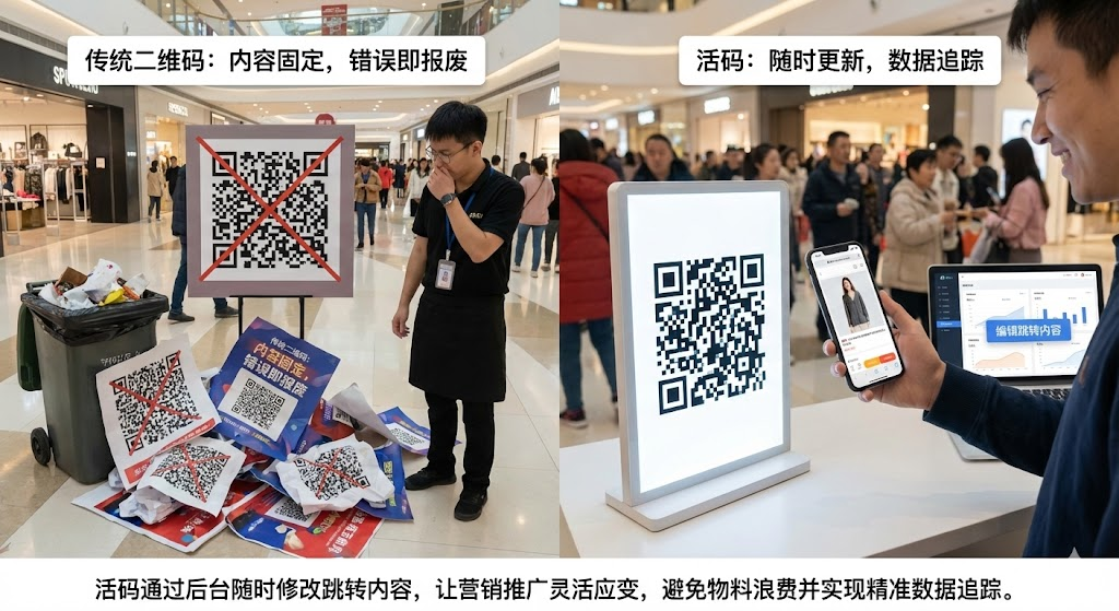 活码是可随时修改跳转内容的二维码,通过中转服务器实现码不变、内容可变。做营销推广时,传统二维码存在致命硬伤:海报印了5000张,发现链接填错了,整批物料直接报废;双十一活动结束,想把二维码换成新品推广页,但码已经印上去了;想分析扫码用户的地域分布和访问时段,普通二维码根本拿不到数据。活码的出现彻底改变了这个局面,外观和普通码一模一样,但你能在后台随时切换跳转页面、查看扫码数据、设置访问规则,一个码搞定多场景需求,让营销真正做到灵活可控。