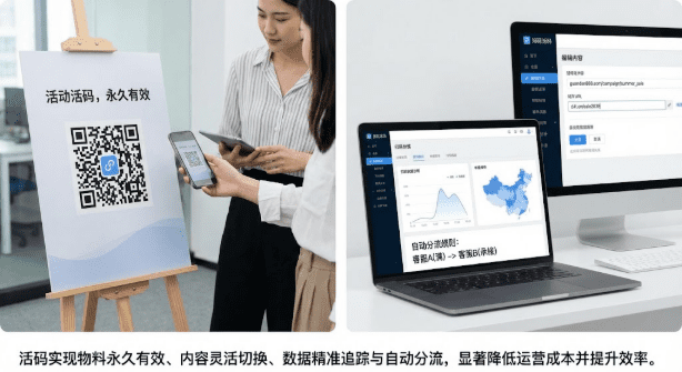 • 物料永久有效:印刷海报、公众号文章、电商包裹卡等物料一次制作,后台随时切换二维码,无需重复投入成本。教育机构使用活码后,5000张地推海报自动分流到3个客服号,流量零浪费。