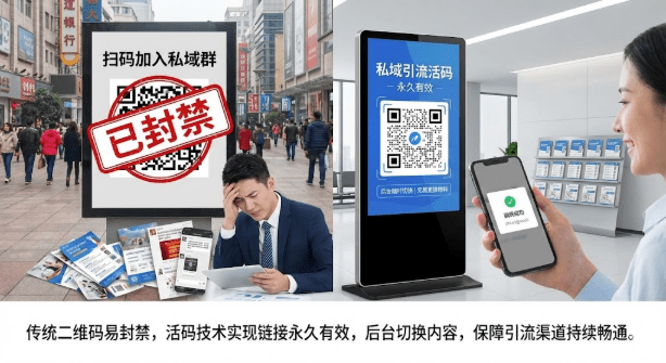 做私域引流最怕什么?刚在朋友圈、公众号、海报上铺了几百个渠道,二维码就因为扫码人数过多被封了。重新换码?之前投放的物料全部作废,时间、成本统统打水漂。活码能彻底解决这个问题——一个永久链接,后台随时切换真实二维码,无需重新制作物料,让你的引流渠道持续有效。
