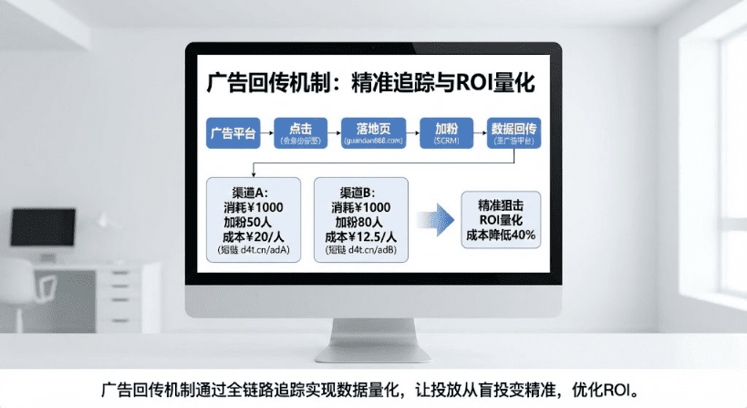 广告回传的本质是给每个广告点击用户贴上「身份标签」,用户从点击广告到访问落地页再到添加微信的全过程都被记录。系统自动把加粉数据回传给广告平台,你能直接看到渠道a消耗1000元加粉50人成本20元每人,渠道b消耗1000元加粉80人成本12.5元每人。