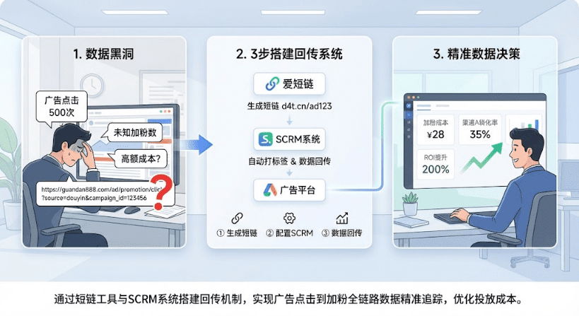 每天烧几千块投广告,到底带来多少个粉丝?哪个渠道转化最好?大多数投放专员都卡在这里:广告后台显示点击了500次,但企业微信里到底加了多少人、哪些是广告带来的,完全分不清。本文教你用短链工具 scrm系统搭建回传机制,实现广告点击到加粉全链路数据打通。三步配置完成后,每个渠道的加粉成本、转化效果一目了然,帮你精准优化投放策略,降低获客成本。