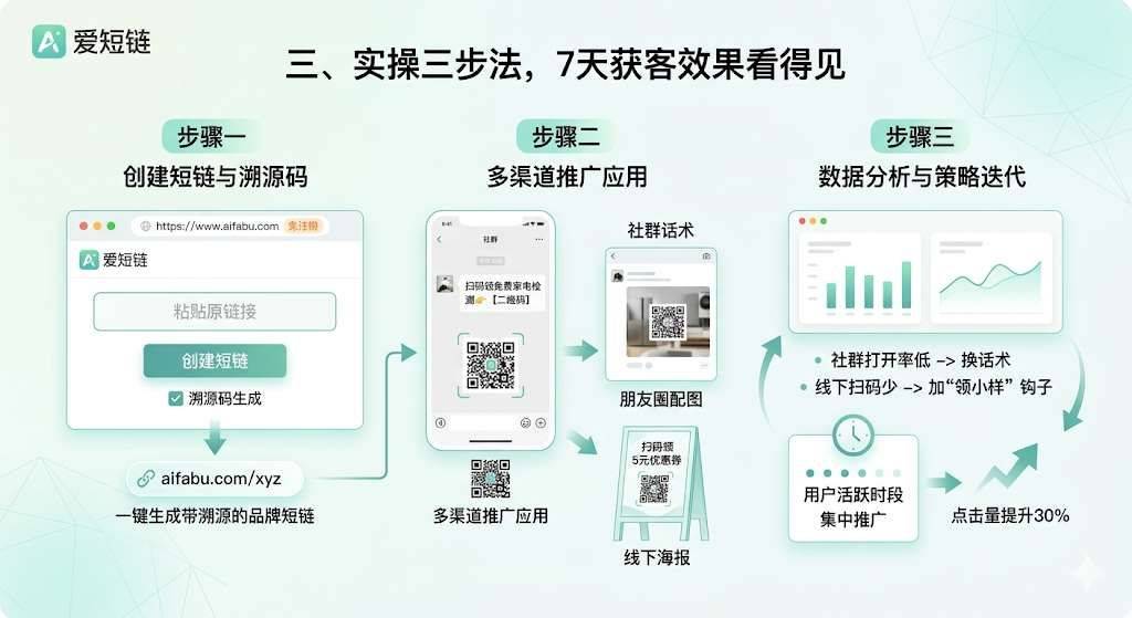 有家家政店老板用爱短链做了“免费家电检测”的品牌短链,发了5个业主群,7天就获得1200 点击,转化了12单,获客成本直接降了40%,比之前瞎发传单效率高太多!