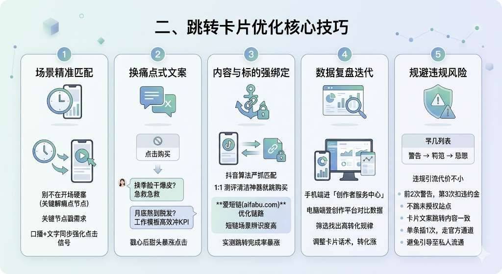 是不是挂了抖音跳转卡片,点的人却寥寥无几?引流效率低、变现链路卡壳,急得直挠头? 别慌!搭配工信部备案的爱短链(https://www.aifabu.com) 5个直接上手的优化技巧,能让卡片转化率提升30%-50%,彻底打通抖音引流变现的关键环节!