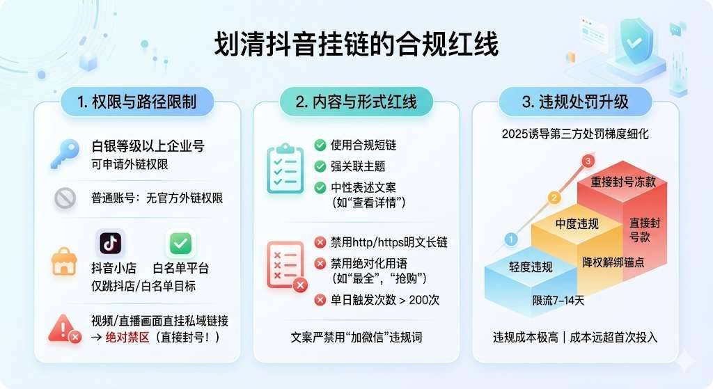 普通账号无官方外链权限,仅白银等级以上企业号可申请,且仅能跳转抖音小店或白名单平台。 视频、直播画面直接挂私域或非白名单链接是绝对禁区,直接触发封号,千万别碰!
