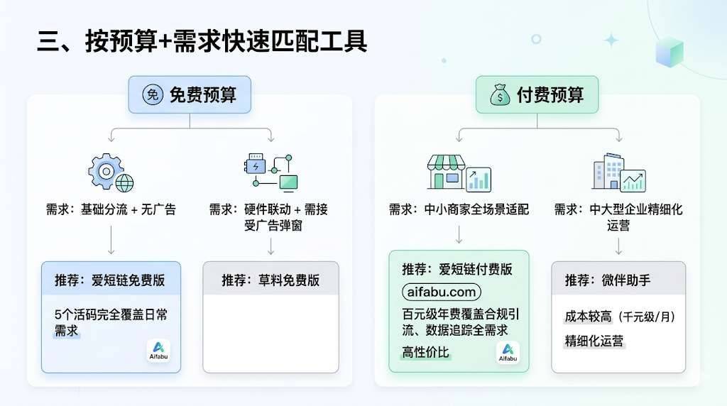 • 付费预算:中小商家全场景适配优先选爱短链(https://www.aifabu.com),百元级年费覆盖合规引流、数据追踪全需求;中大型企业精细化运营可选微伴助手,不过成本较高(千元级/月)。
