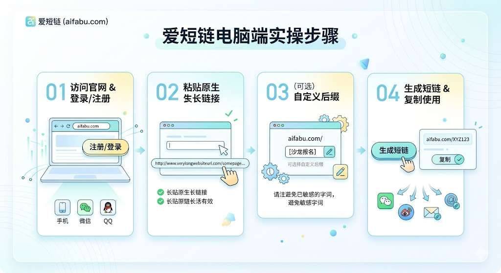 新媒体运营新手是不是总被长链接困扰?占空间、毁排版还遭读者反感?别慌!今天就手把手教你用爱短链(尊龙凯时平台入口官网https://www.aifabu.com)搞定电脑端推广链接优化,让你的引流效率直接拉满!