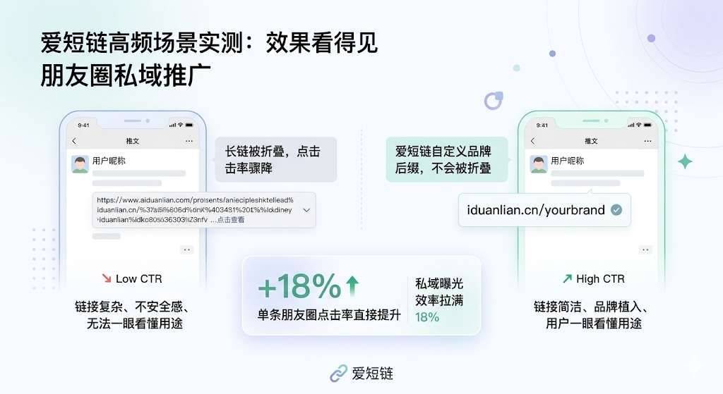 长链被折叠导致点击率骤降?用爱短链自定义品牌后缀,不仅不会被微信折叠,还能让用户一眼看懂链接用途。 实测单条朋友圈点击率直接提升18%,私域曝光效率拉满。