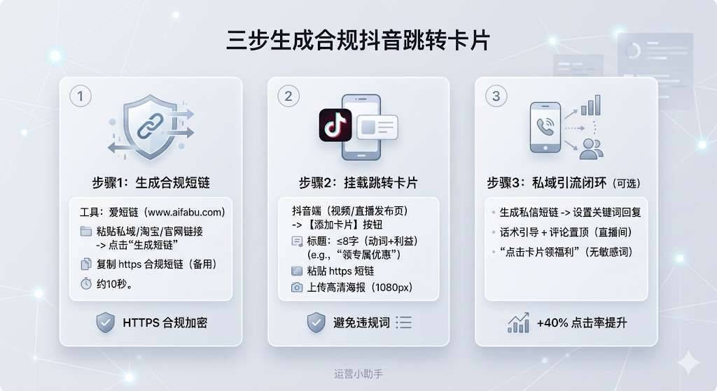 别慌,抖音官方认可的跳转卡片 「爱短链」,完美解决三大引流痛点:合规防风险、提转化效率、可追踪优化。今天就教你三步制作合规跳转卡片,安全把抖音流量变成真金白银!